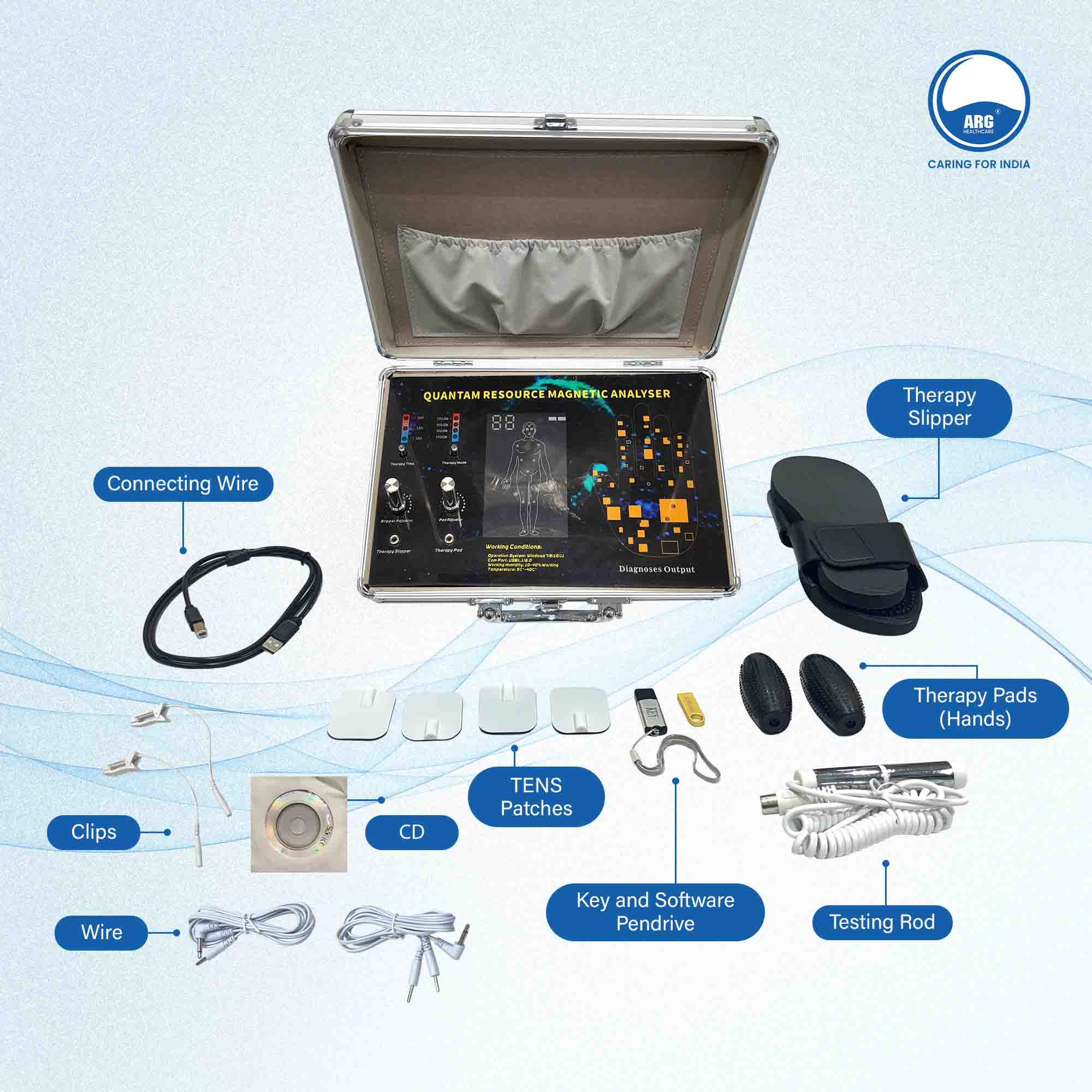 Introducing the cutting-edge ARG Body Analyzer with TENS Therapy! This 31G+ 3 in 1 generation device offers 55 comprehensive health reports for men, women, and children in just one minute. Simply hold the testing rod for painless, non-invasive analysis and enjoy relief from pain and stress.