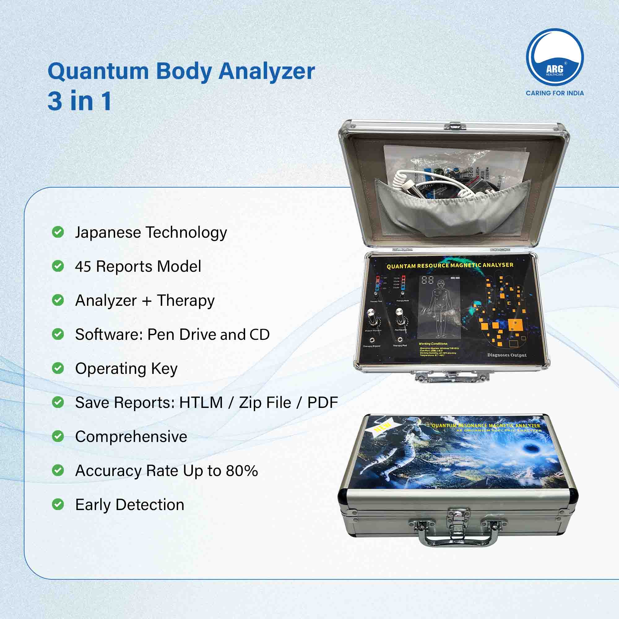 Experience holistic health insights with 3in1 scanning, 54 comprehensive reports, effective TENS therapy, advanced Japanese technology, and portable convenience. Get accurate results and pain relief anytime, anywhere.