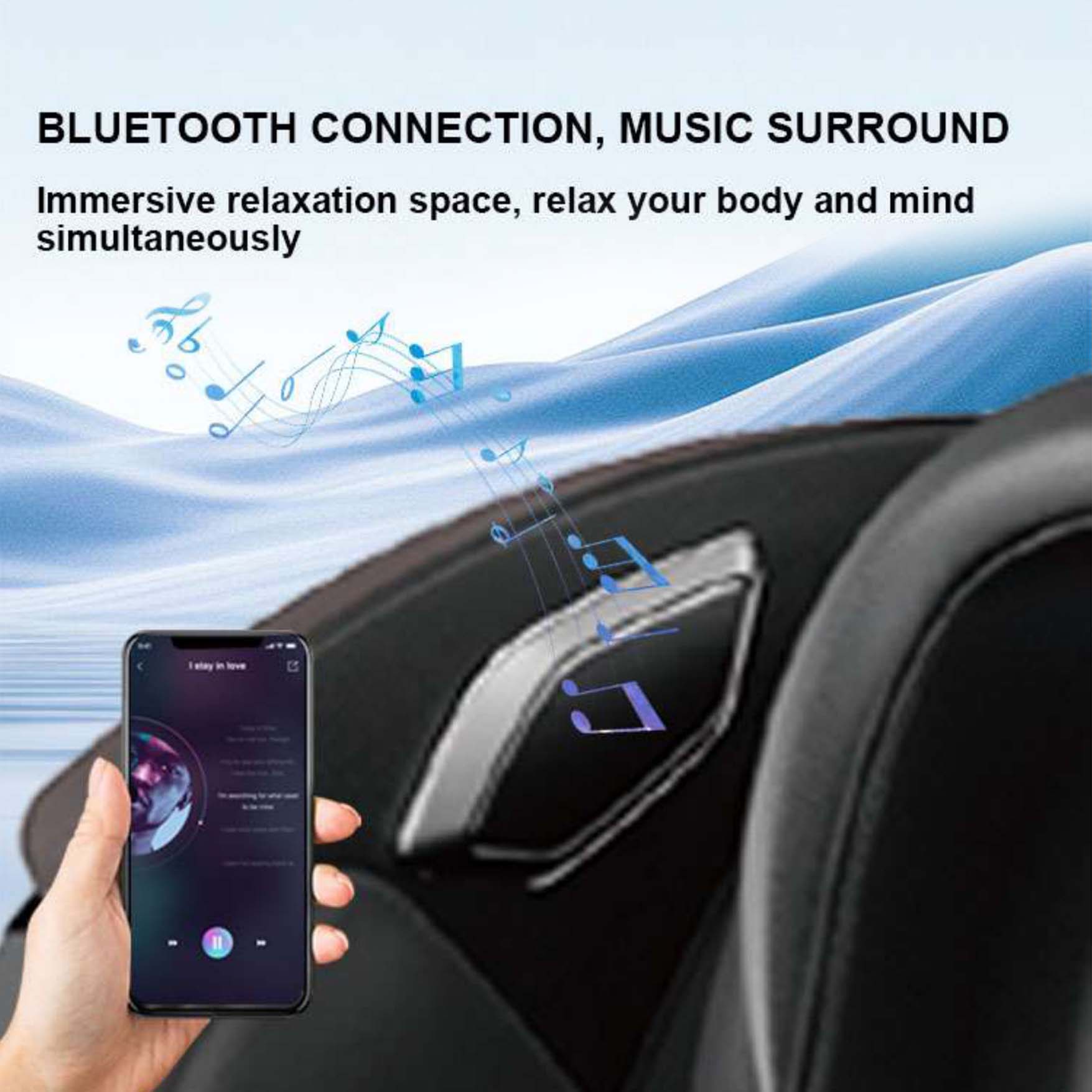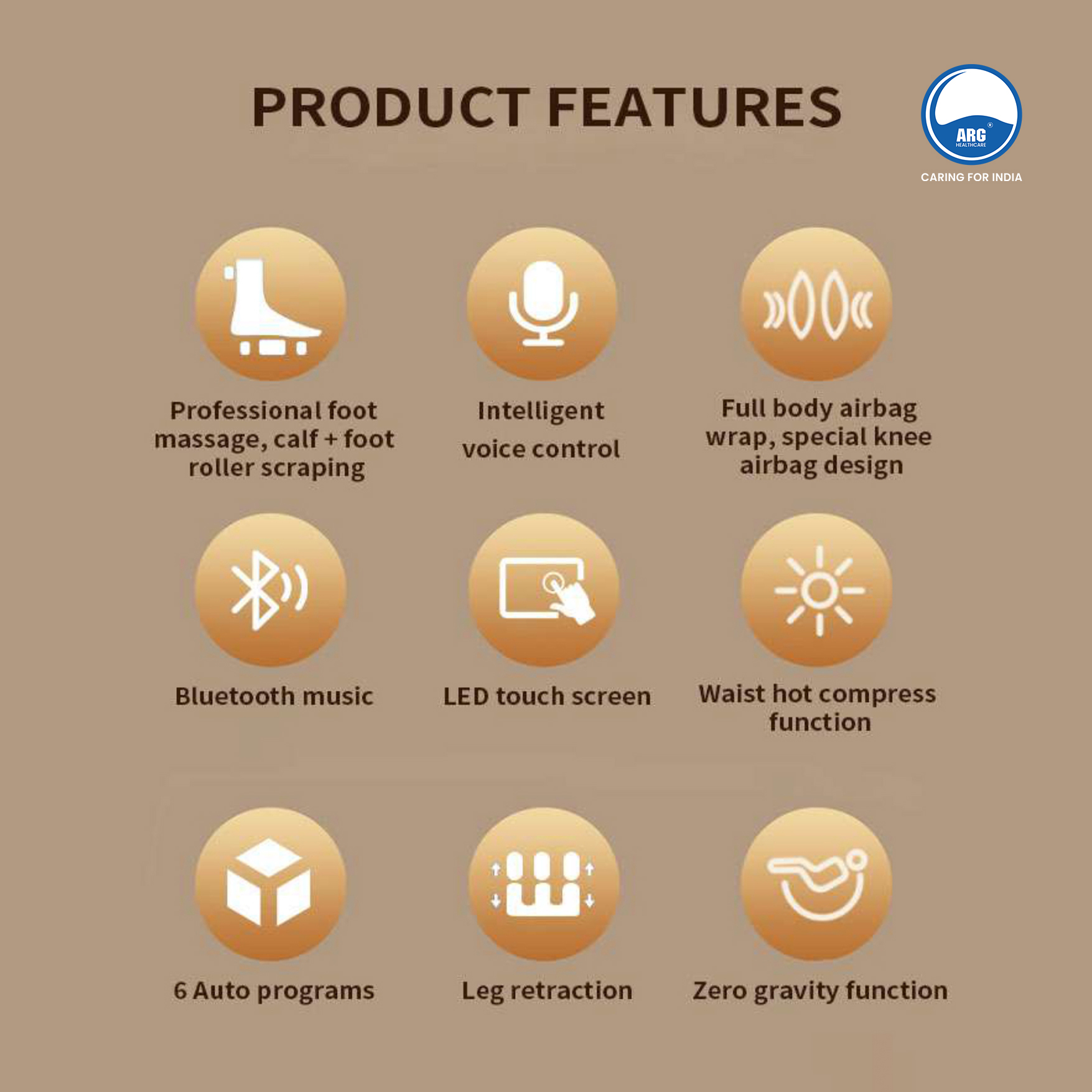 calf and foot rollers, waist heat therapy, Bluetooth music, and smart LED touch screen.