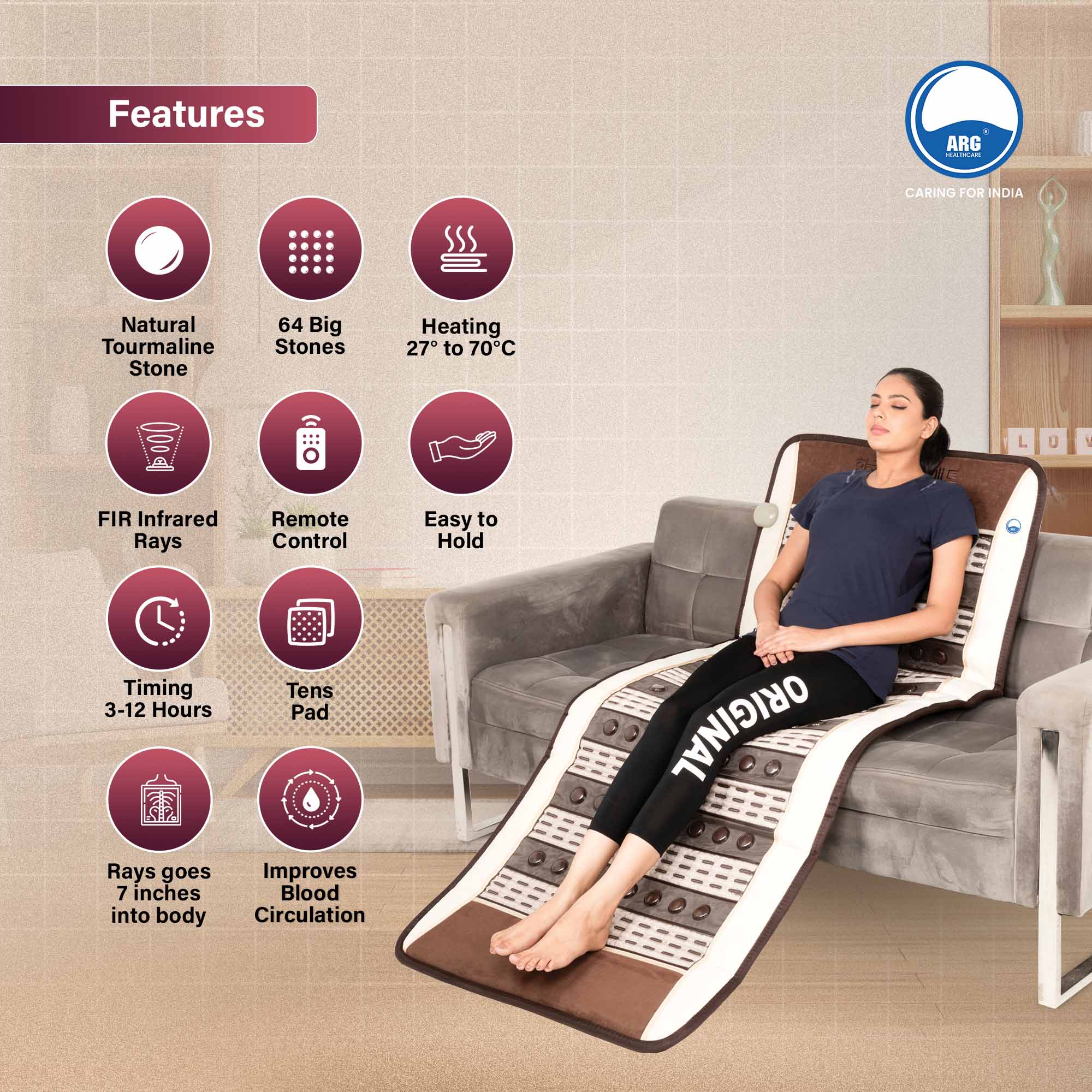 Experience enhanced blood circulation, pain relief, and relaxation with ARG Ceratonic Heating Mat. Harnessing FIR infrared rays and natural stones, it promotes immunity, detoxification, and overall wellness for a rejuvenated body and mind.