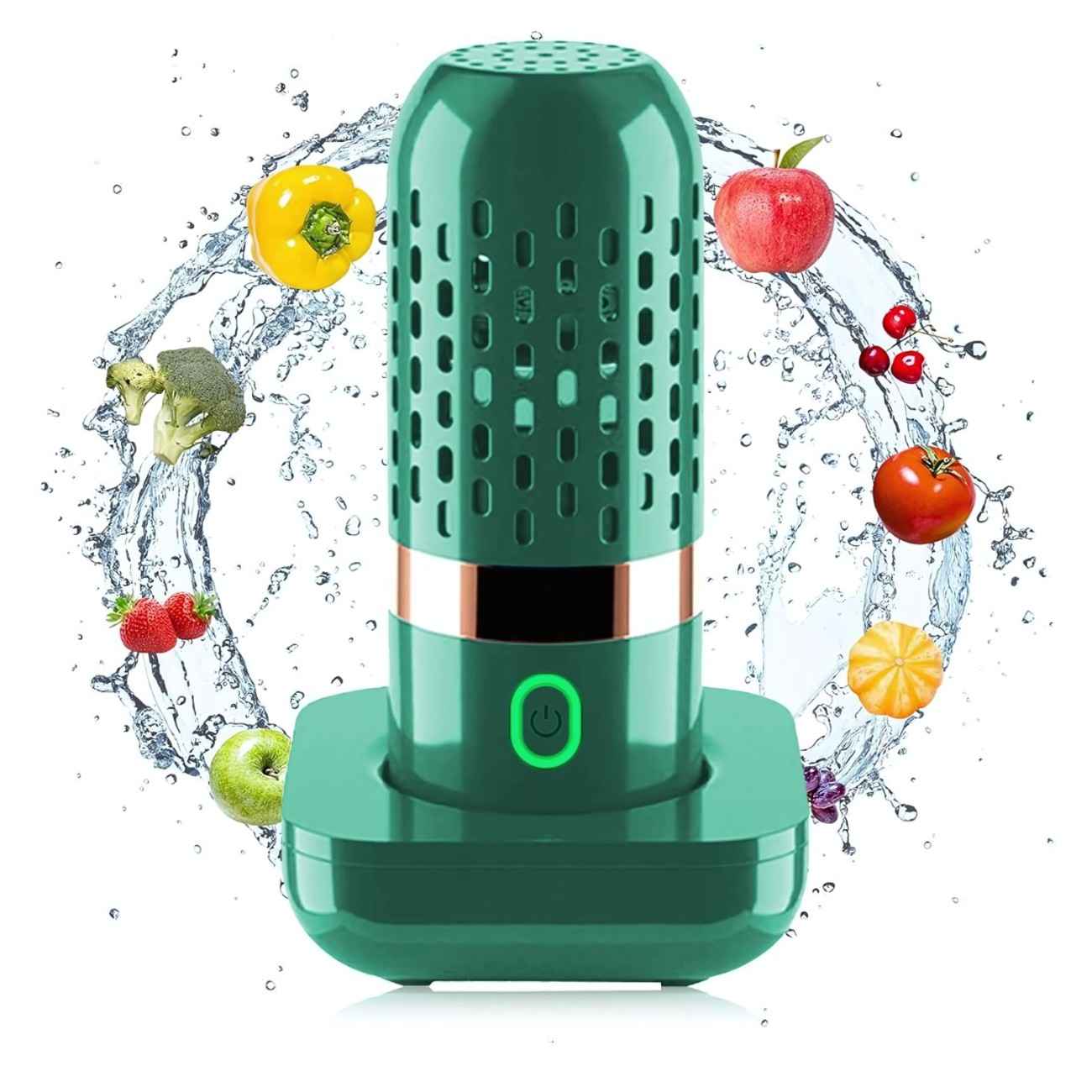 The Fruit & Vegetable Purifier features advanced electrolysis technology for effective cleaning, a USB-rechargeable design