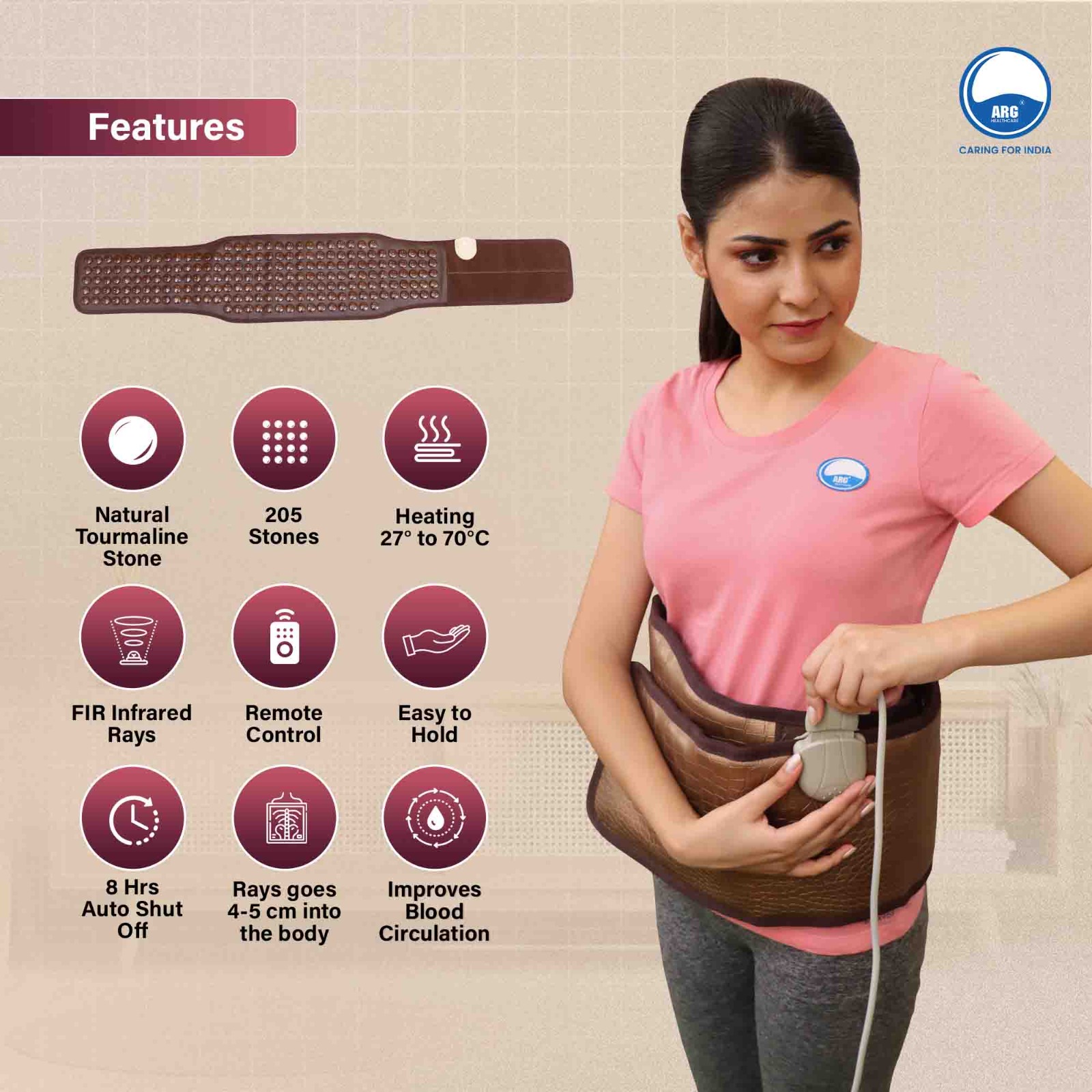 Introducing the ARG Tourmaline Heating Belt (ARG718D), embedded with 205 natural tourmaline gemstones emitting infrared rays for deep penetration. Ideal for pain relief, circulation enhancement, and muscle relaxation. Features temperature control, easy storage, and versatile usage.